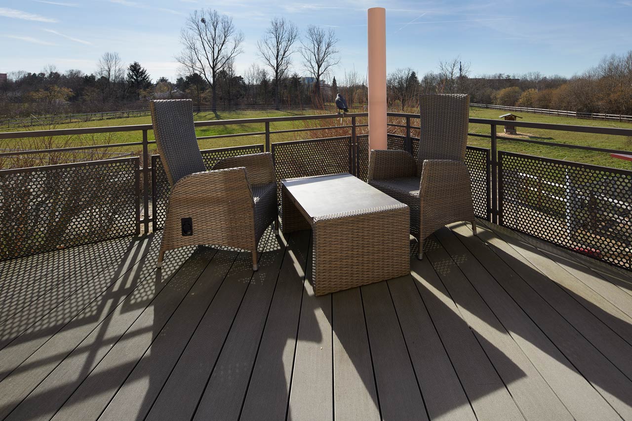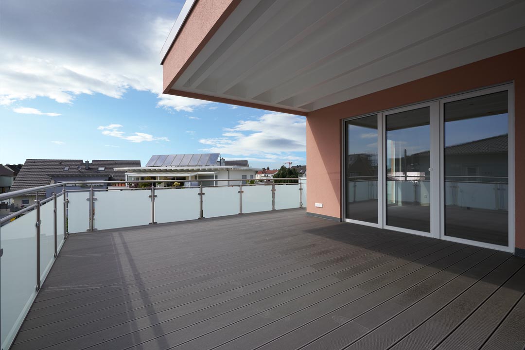 Eine Südterrasse hat viel Sonne. Der Belag ist ein Bestwood-Boden aus strapazierfähigem WPC ist - er ist lichtstabil und spleißt kaum.