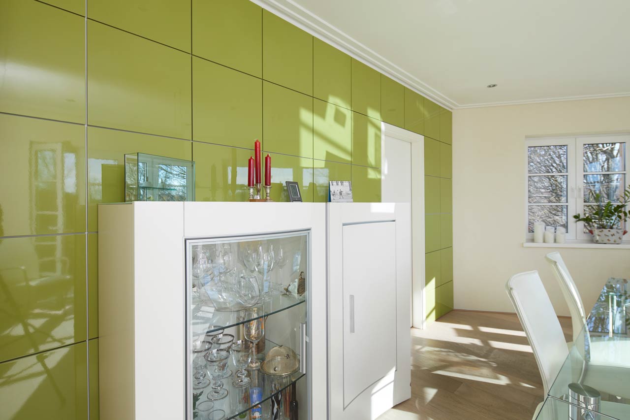 Eindrucksvolle Wand aus hochglanz-lackierten MDF-Paneelen