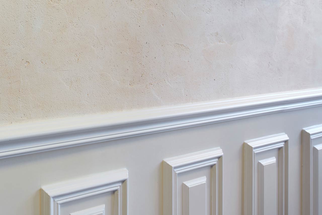 Zeitreise mit einem floralen Motiv aus der GrĂŒnderzeit: der Lincrusta-Wandsockel mit Profilabschlussleiste erscheint in einem blassem Lachs-Ton.