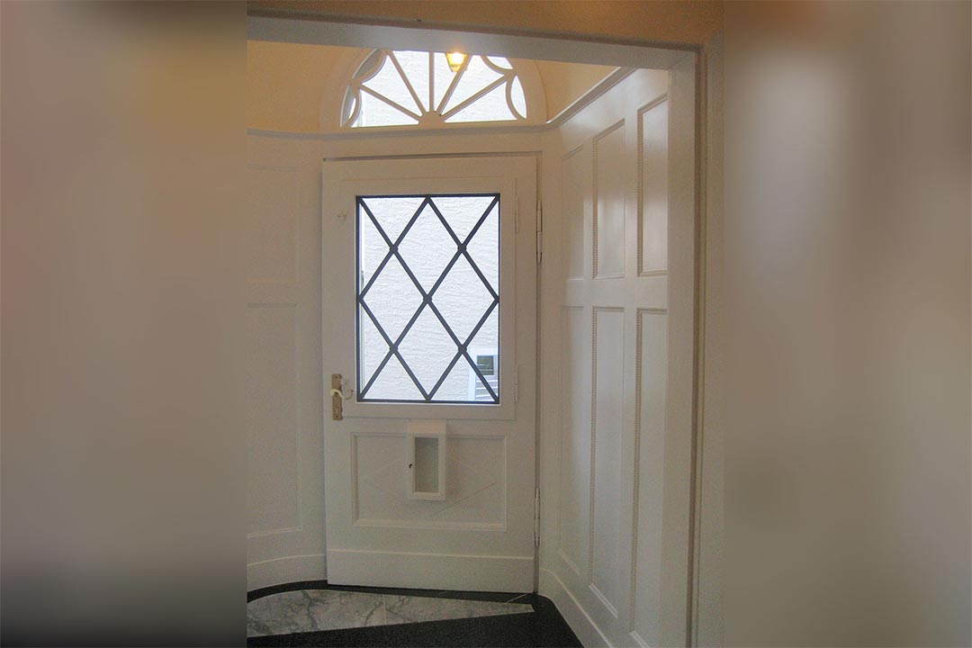 Passend zur HaustĂŒr wurde das Treppenhaus samt Stufen und Kassettenwandverkleidung sensibel renoviert.