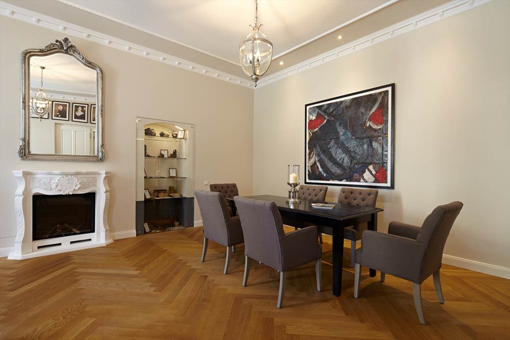 Gediegen und reprÀsentativ: Deckenfriesgestaltung mit Deckenprofilleisten und Dekorleisten mit Konsolen.