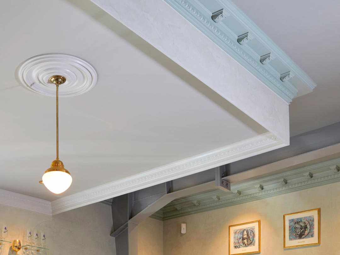 Diesem Deckenbalken mit seinen kleinen Konsolen und seiner besonderen Form sieht man nicht an, dass er eigentlich aus lackiertem Hartschaum besteht.