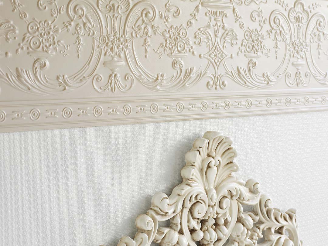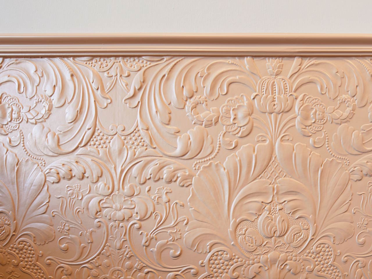Zeitreise mit einem floralen Motiv aus der GrĂŒnderzeit: der Lincrusta-Wandsockel mit Profilabschlussleiste erscheint in einem blassem Lachs-Ton.