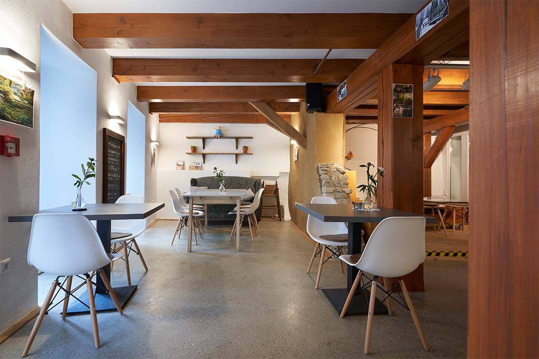 Im MĂŒhlencafĂ© an der StĂŒmpelschen MĂŒhle in Paderborn hat KLOKE die konstruktiven Hölzer einheitlich lasiert und eine mineralische Wandgestaltung eingebracht.