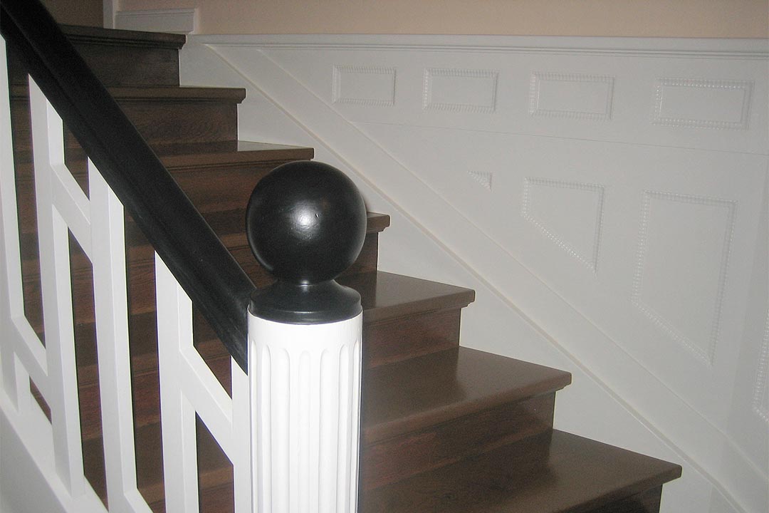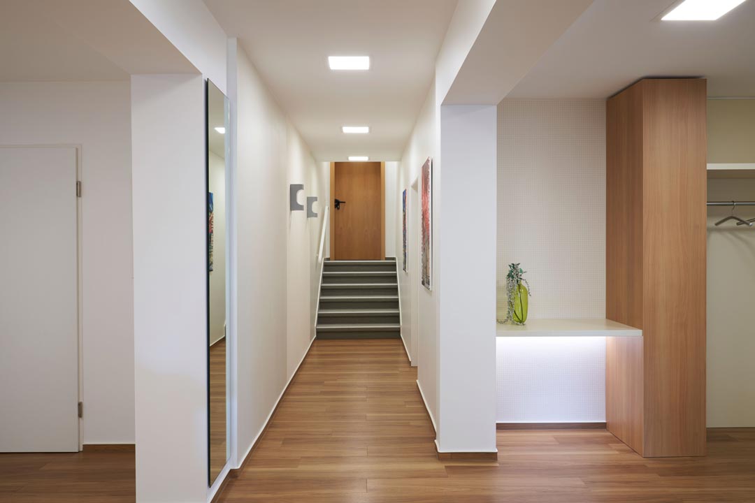 Passend zur HaustĂŒr wurde das Treppenhaus samt Stufen und Kassettenwandverkleidung sensibel renoviert.