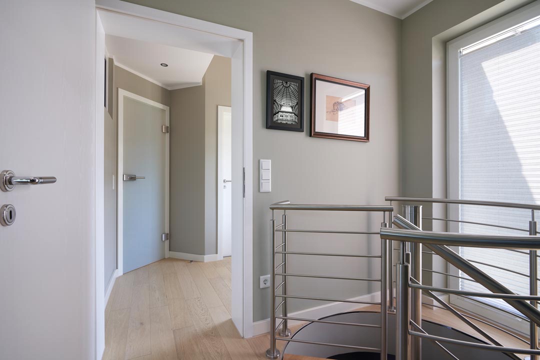 Ăber einen hellen Dielenboden und ein angenehmes Grau sind die Zimmer in der oberen Etage miteinander verbunden