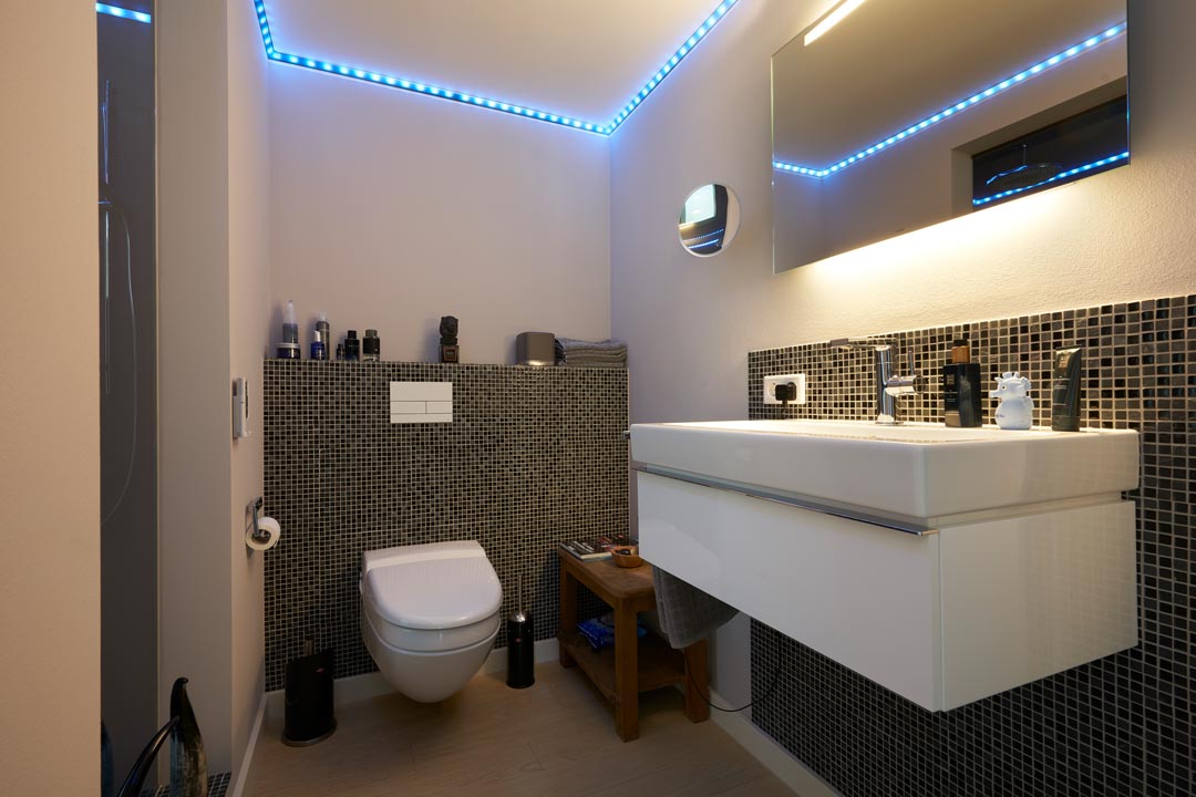 Moderne Badgestaltung mit ansprechenden Farben und Chrom. Die GlÀttetechnik wurde als Spritzschutz eingesetzt.