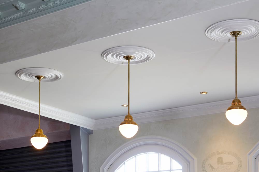 Diesem Deckenbalken mit seinen kleinen Konsolen und seiner besonderen Form sieht man nicht an, dass er eigentlich aus lackiertem Hartschaum besteht.